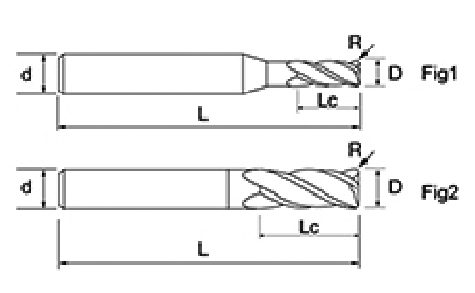 | خیر | قطر D | زاویه آر R | طول فلوت ال سی | طول کلی L | شانک دیا د | شمارش تیغه اف |