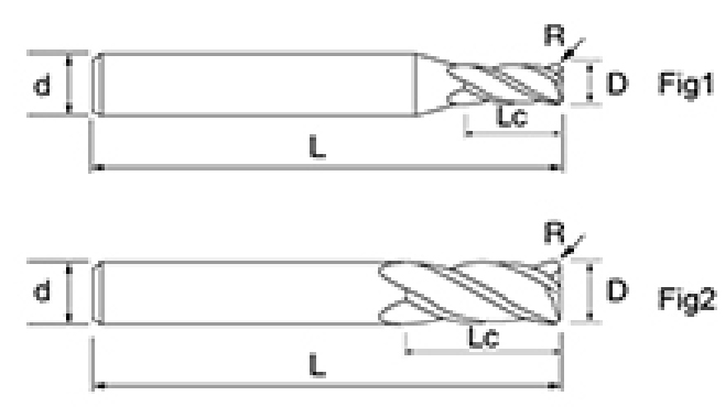 | خیر | قطر D | زاویه آر R | طول فلوت ال سی | طول کلی L | شانک دیا د | شمارش تیغه اف |